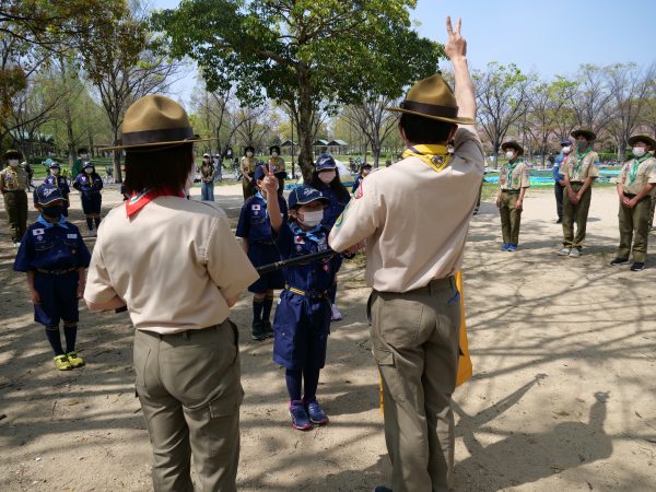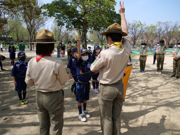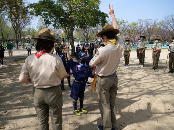 入隊式では1年間ジュニアビーバーで活動してくれたスカウトが晴れてビーバースカウトとなりました。ビーバーは昨年と同じく3名でスタートとなります。来年の4月には3倍の人数に増やせるよう皆頑張って活動をしましょう。