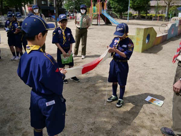 くまスカウトは国旗掲揚、国旗降納を練習旗をつかって練習をいたしました。